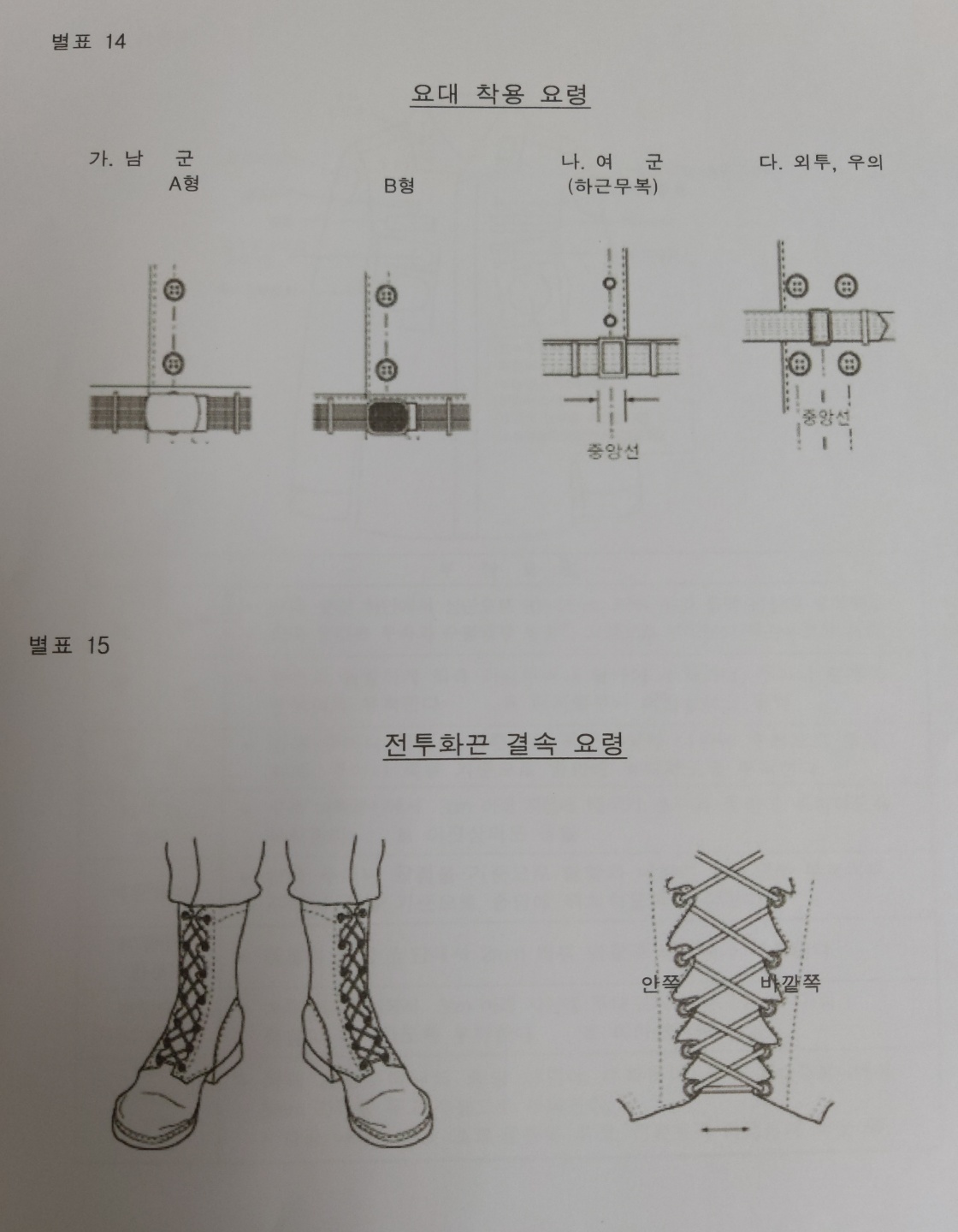 - 베레모 학년장 부착, 요대 착용 및 전투화끈 결속방법